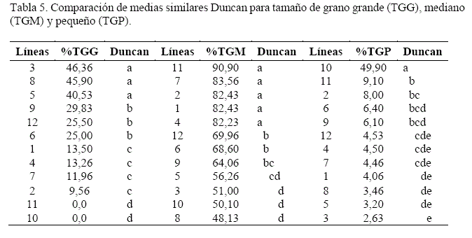 La comparación de medias de Duncan (Tabla 5) para el tamaño de grano grande permite diferenciar cuatro grupos de similitud, las líneas 3, 8 y 5 en el grupo "a" con mayores porcentajes de grano grande: 46,4%; 45,9% y40,53% respectivamente.