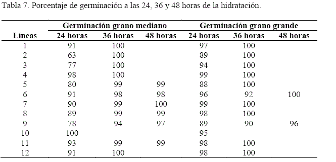 El porcentaje de germinación a las 24 horas en grano mediano plantea diferencias entre líneas, este parámetro advierte sobre la eficiencia de germinación y la uniformidad de la misma. Cabe señalar que todas las líneas superaron el 80% germinación a las 36 horas (Tabla 7), denotando eficiencia en el proceso de germinación de cada línea, por influencia de la temperatura. La temperatura mínima registrada en laboratorio fue de -4°C y la máxima de 22°C la máxima.