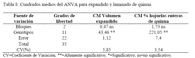 La Tabla 8, reporta los cuadrados medios del ANVA para el volumen expandido (obtención de pipocas) y laminado de quinua (hojuelas enteras obtenidas después del tamizado), como resultado de un ensayo previo para determinar la humedad adecuada para el acondicionado y tiempo de oreo, además, se estableció una temperatura constante.