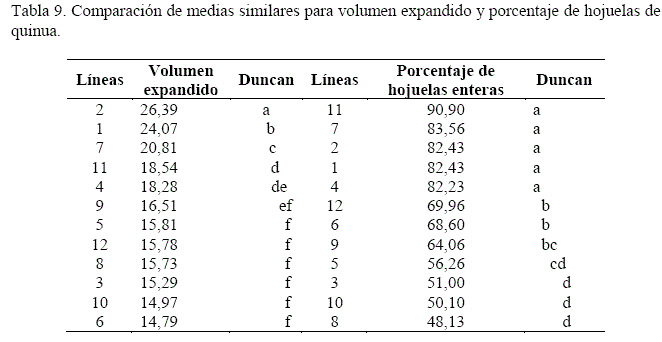 En la comparación de medias similares Duncan (Tabla 9), la línea 2 sobre sale con un volumen de 26 ce de un volumen inicial de 10 ce, la misma se encuentra en el grupo "a" destacada entre las demás por su excelente calidad para el expandido, además de presentar un agradable color y apariencia; la línea 1 del grupo "b" también obtuvo un buen expandido, por otra parte, los genotipos 11, 9, 12 y 3 con valores superiores al 80% de hojuelas enteras, perteneciendo al grupo "a" de Duncan, que poseen buenas características para el mencionado proceso de transformación.