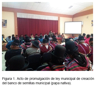 En América Latina y el Caribe, se registra problemas de ingesta insuficiente de alimentos ricos en micronutrientes (hierro, yodo, zinc, vitamina A), generando desequilibrios en la dieta nutritiva, la desnutrición en la niñez de menores de cinco años inhibe su desarrollo cognitivo y afecta a su estado de salud, por ello, atender este problema es esencial para asegurar la supervivencia y desarrollo de los niños, una alternativa es el cultivo de papa que es importante en la región, por su valor como cultivo de seguridad alimentaria. Se trabajó con variedades de papa nativa de Saq'ampaya, Qhati Señorita y Chilltu con alto contenido de Hierro y Zinc, para lo cual, se desarrolló una norma municipal para la creación de un banco municipal de semillas de variedades nativas aplicando una metodología participativa, para sistematizar y analizar el conocimiento académico de los interlocutores, agricultores y tomadores de decisión en el nivel local, utilizando para ello el diálogo honesto, simple y franco que ha permitido reflejar las experiencias de los agricultores, cuyo resultado se refleja en la promulgación de la Ley municipal N° 102/2016 "Ley de Creación de Banco de Semillas Municipal (papa nativa)" y su consiguiente Decreto Edil 008/2017 Reglamento general de la Ley de Creación de Banco de Semillas Municipal de papa nativa. Con la promulgación de la Ley se garantiza el funcionamiento y sostenibilidad del Banco Municipal de Semillas de variedades de papa nativa (Saq'ampaya, Qhati Señorita y Chiltu) en beneficio de la población con enfoque hacia la seguridad y soberanía alimentaria.