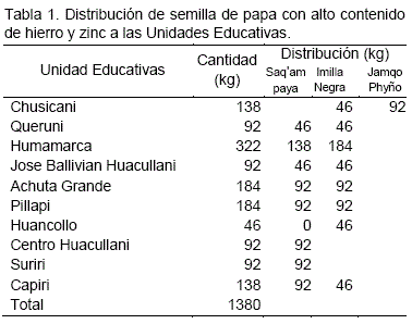 Con el propósito de conservar las características benéficas de la semilla de papa nativa con alto contenido de hierro y zinc, el proyecto ha previsto la distribución de dichas semillas a unidades educativas (Tabla 1) y productores de las comunidades (Tabla 2) para la multiplicación de papa nativa, con el apoyo de asistencia de técnicos del proyecto y del municipio, cuya relación de distribución se muestra en la Tabla 1 y 2.
