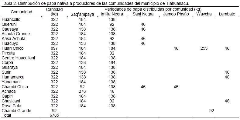 Para la distribución de semilla de papa nativa, esta fue seleccionada conjuntamente autoridades originarias y el municipio de Tiahuanacu, tomando criterios de disponibilidad de terreno disponibilidad de tiempo para asistir a capacitaciones y asistencia técnica.