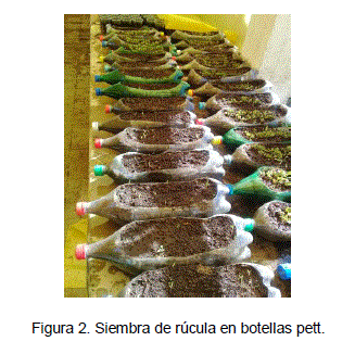 Se utilizó botellas pett para realizar el ensayo, en el cual se preparó tierra fértil del lugar y humus de lombriz, en diferentes cantidades en función al volumen, para lo cual se utilizó un vaso calibrado para determinar el porcentaje de cada uno de los componentes del sustrato. La siembra de las semillas se realizó en botellas pett en golpes de tres semillas cada uno (Figura 2).