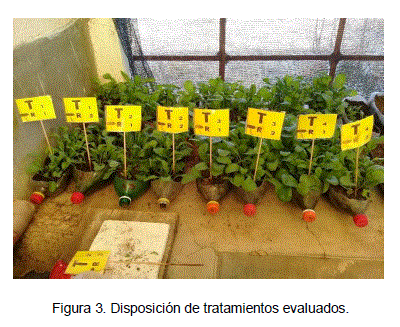 El manejo de los tratamientos fue el mismo para todos, con el mismo número de escardes, deshierbes, riegos y otras prácticas culturales que realiza el agricultor. Trascurridos 15 días se procedió a ralear las plantas que brotaron, dejando solamente 10 plántulas en cada botella. Periódicamente se retiró malas hierbas que crecían en las botellas. La Figura 3 presenta la disposición de los tratamientos.