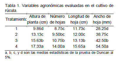 El tratamiento 4 fue el mejor para todas las variables agronómicas, mientras que con el tratamiento 1 (testigo) se obtuvo los peores valores.