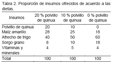 La alimentación se realizó en dos horarios: por la mañana (09:00) y por la tarde (16:00), las proporciones se distribuyeron 40:60 del total de alimento ofrecido por día. Incluye el alimento concentrado y su respectivo forraje como aditivo. La cantidad de alimento ofrecido se calculó en función al peso vivo, se consideró el 10 % de su peso. Al inicio del presente estudio, el peso promedio de los cuyes fue de 310 g, peso que fue utilizado para realizar los cálculos correspondientes, siendo que el 10 % representa 31 g de alimento que es la cantidad total promedio de alimento por día que requieren los cuyes. En la Tabla 2 se muestra el detalle de los insumos utilizados para elaborar las dietas a diferentes niveles de polvillo de quinua.