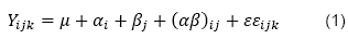 Dónde: Yijk= valor del k-ésimo cuy del j-ésimo nivel del factor B en el i-ésimo nivel del factor A; µ = media general del experimento; αi = efecto del i-ésimo nivel del factor A; βj = efecto del j-ésimo nivel del factor B; (αβ)¿J= efecto de la interacción entre i-ésimo nivel del factor A con el j-ésimo nivel del factor B; εεijk = Error experimental del k-ésimo cuy del j-ésimo nivel del factor B en el i-ésimo nivel del factor A.