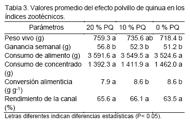 El análisis de varianza para esta variable mostró que existieron diferencias altamente significativas por la aplicación de diferentes niveles de polvillo de quinua en la dieta. La prueba de medias Duncan evidenció que el tratamiento con 20 % de PQ presentan el mejor valor (7.9 g g-1), que significa que se requieren 7.9 g de alimento para producir un gramo de peso vivo, es decir, que con este tratamiento se tiene menor consumo de alimento, pero mayor ganancia en el peso vivo con respecto a 8.6 g g1 para el tratamiento con 10 % de PQ y el tratamiento testigo (Tabla 3).