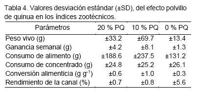 También se observó que, en los valores de la desviación estándar, los resultados favorecen más cuando los animales son tratados con un 20 % de PQ, es decir que, es el mejor tratamiento ya que muestran una mayor uniformidad en la ganancia de peso vivo. Por otra parte, Castro y Téllez (2015), reportan que el peso final de cuyes alimentados con concentrado de diferentes niveles de desecho de quinua (DQ), durante 72 días de evaluación, se registraron valores de 1 107.5 y 1 091.2 g con un 40 y 60 de DQ respectivamente, superando al tratamiento control (0 % DQ) con 967.5 y 20.0 % de DQ con 1 035.4 g, notándose que el empleo de niveles mayores al 40 % desfavorece el desarrollo de los animales. Por tanto, el estudio demuestra que la adición de polvillo de quinua en diferentes niveles permite lograr mayores rendimientos en el peso vivo de los animales en estudio, hecho atribuible a las características nutritivas presentes en este insumo.