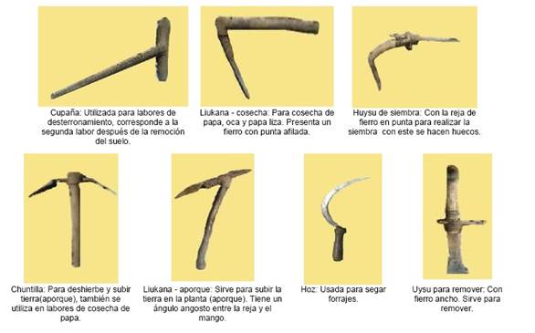Durante la investigación se han identificado herramientas tradicionales como la Liukana, Uysu de siembra y Uysu de labranza, aunque sólo en algunas familias; esto muestra que estas herramientas y su conocimiento se están perdiendo en esta zona, las mismas que se presentan en la Figura 2.