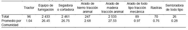 En los datos que se presentan en la Tabla 6, se puede observar que la zona presenta un promedio de 2.7 tractores por comunidad y un ingreso promedio de 1.6 tractores de otras comunidades. Los implementos de uso más frecuente en la zona son los arados de vertedera de tres cuerpos, la rastra excéntrica de discos y en menor proporción las moto-fumigadoras.