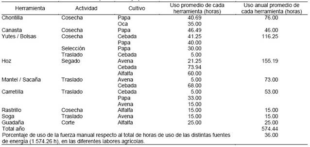 La disponibilidad de la mano de obra y la eficiencia de las herramientas manuales son factores que determinan la productividad de la mano de obra; del mismo modo el manejo adecuado de los cultivos, el requerimiento de energía y los costos de producción. Un primer acercamiento a esta temática es conocer el tiempo de uso, tipo de herramientas e identificar las labores en las cuales se utilizan; como se muestra en la Tabla 8. Así mismo, se presenta el tiempo de uso de cada herramienta según la actividad y el tipo de cultivo; también se hace referencia a los utensilios de apoyo a la actividad agrícola que son muy importantes ya que prestan un servicio fundamental, tal es el caso de las canastas usadas en el recojo de la papa, las bolsas y las sacañas cuyo uso es muy diversificado. Las herramientas de más uso son la chontilla y la hoz, la primera es usada en labores culturales y de cosecha de papa y la hoz en el segado de cebada, avena o alfalfa.