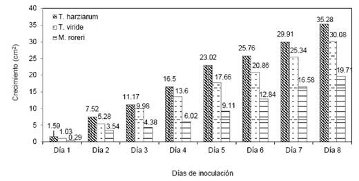 La velocidad de crecimiento libre de microorganismos los agentes biocontroladores bajo crecimiento libre en medio PDA demostraron tener mayor velocidad de crecimiento llegando a cubrir en su totalidad la caja Petri a los ocho días de inoculado siendo que T. harziarum llego a cubrir la caja Petri con 35.28 cm2, siendo seguido por T. viridae con 30.08 cm2 a los ocho días a una temperatura constante de 28 ºC coincidiendo estos datos con lo mencionado por (Infante et al., 2009) que indica que Trichoderma está biológicamente adaptado una colonización agresiva, abundante esporulación sobre una amplia gana de sustratos, dándole de esta manera una ventaja biológica sobre otros microorganismos antagónicos por lo que puede ejercer así una función de control por la competencia de nutrientes. La velocidad de crecimiento de M. roreri fue significativamente menor ya que al octavo día solo alcanzó un crecimiento de 19.71 cm2 bajo condiciones in vitro. El seguimiento de crecimiento día por día se refleja en la Figura 1.