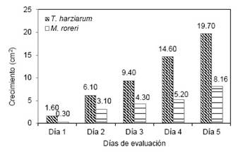 La prueba dual entre T. harziarum y M. roreri en condiciones in vitro realizada bajo un DCA mostró que desde un principio T. harziarum tomó la ventaja de velocidad de crecimiento, siendo que el primer día de evaluación obtuvo 1.60 cm2 de crecimiento en comparación con M. roreri que logró solamente 0.30 cm2 de crecimiento, al quinto día de evaluación se llegaron a encontrar los microorganismos alcanzando a T. harziarum un crecimiento de 19.70 cm2 y M. roreri obtuvo un crecimiento de 8.16 cm2, posteriormente ambos inhibieron el crecimiento aproximadamente un día para luego continuar el crecimiento T harziarum sobre M. roreri micoparasitandolo invadido totalmente el micelio de T. harziarum sobre M. roreri (Figura 2).