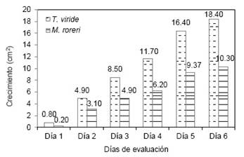 La prueba dual entre T. viride y M. roreri muestra que en el primer día apenas se notaba una diferencia de crecimiento siendo T. viride de 0.8 cm2, en comparación con M. roreri que fue de 0.2 cm2, con el transcurso de los días esta brecha se fue más notoria, finalmente se encontraron al sexto día T. viride un crecimiento de 18.4 cm2, en comparación con M. roreri que alcanzó un crecimiento de 10.3 cm2 (Figura 4).