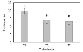 La incidencia de moniliasis en los frutos de cacao mostraron menores porcentajes en lo tratamientos con los antagonistas, durante las dos primeras semanas, después de la aparición de los síntomas, sin diferencia estadística frente al control. Aunque las diferencias no alcanzaron los niveles de significación se destaca que la menor incidencia ocurrió en los frutos inoculados con el hongo antagonista Trichoderma harziarum (T2), aislamiento que en condiciones in vitro inhibió por completo el crecimiento y esporulación de M. roreri (Villamil et al., 2015). A partir de la tercera semana la incidencia de moniliasis fue del 100 % en todos los tratamientos, independientemente de la presencia de antagonista.