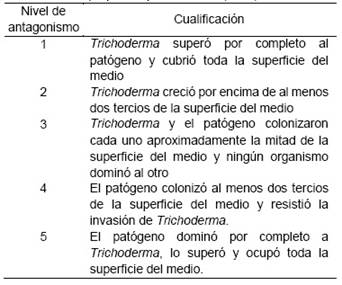 En la prueba cualitativa se compararon las cepas teniendo en cuenta la capacidad antagónica, de acuerdo con la escala propuesta por Bell et al. (1982) (Tabla 1).