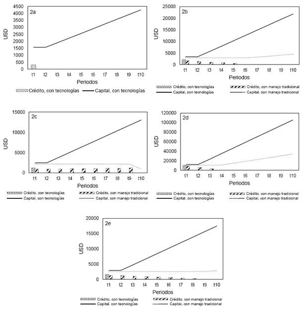 El capital puede aumentar entre periodos si se implementan las dos opciones tecnológicas. Aunque este tipo de productor no tiene acceso al sistema financiero tradicional, el modelo sugiere que lograr acceso a crédito para capital de trabajo durante los dos primeros periodos puede beneficiar el sistema productivo, el crédito en el primer periodo de la implementación tecnológica por valor de 2 144 USD y en el segundo periodo por 43 USD (Figura 2b).