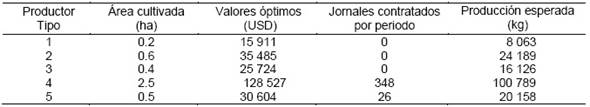 El productor tipo 4 cuenta con la mayor área cultivada 2.5 ha, lo cual le permite alcanzar mayores utilidades totales; sin embargo, su mayor demanda de mano de obra le obliga a contratar trabajadores e incurre en mayores costos, esta deseconomía hace que la utilidad del sistema por hectárea sea menor respecto a la de otros tipos de productores. En este caso se supera la cantidad óptima de producción y aumentarla dependerá de reducir costos de manejo del cultivo, posiblemente con el uso de herramientas tecnificadas y aprovechar las economías de escala que brinde una cantidad mayor de producción.