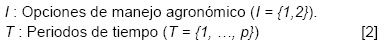 Siendo 𝑝 el número total de periodos considerados. Las opciones de manejo agronómico son cuatro: el escenario actual, el manejo con semilla del productor y fertilización recomendada, el manejo con semilla certificada y fertilización tradicional y el manejo con semilla certificada y fertilización recomendada. Cada periodo tϵT representa un mes, el subconjunto de periodos que excluye el último periodo (t=p) se denota como T´ donde T´= {1, …, p-1}.