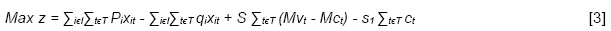 La función objetivo (Ecuación 3) maximiza las utilidades del productor teniendo en cuenta los ingresos por la producción del cultivo, los costos por hectárea cultivada y la mano de obra contratada y vendida para cada periodo de tiempo considerado.