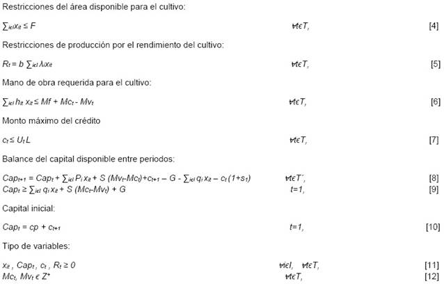 x it : hectáreas cultivadas con la opción 𝑖 ∈ 𝐼 en el periodo tϵT; Rt: producción del cultivo en el periodo tϵT; 𝑐𝑎𝑝𝑡: capital en tϵT; Mct: mano de obra contratada en tϵT; Mv t : mano de obra vendida en tϵT; 𝑐𝑡: monto del crédito para capital de trabajo en el periodo tϵT.