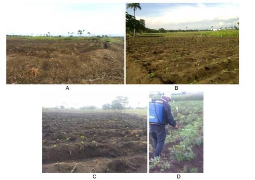 Figura 2 Manejo del cultivo experimental, preparación de terreno para la siembra (A); proceso de germinación de las estacas de yuca (B); plantas de yuca en crecimiento (C); proceso de inyección de fertilizantes al cultivo de yuca (D).