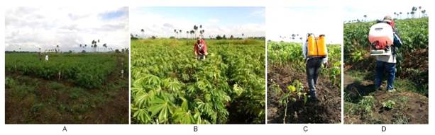 Figura 3 Aplicaciones experimentales, aplicación de NPK a los tres meses (A); aplicación de abono foliar (B); aplicación de fertilizante en drench (C); aplicación motorizada de fertilizantes en el cultivo de yuca (D).