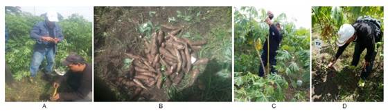 Figura 4 Variables y parámetros medidos, medición de diámetro de raíces de yuca (A); cosecha de raíces de yuca en campo (B); medición de altura de plantas (C); medición del grosor del tallo (D).