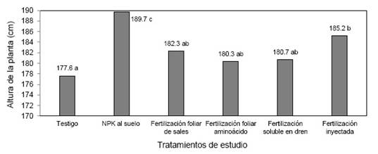 En estudio realizado por Valdez y Hernández (2014), en la región Norte del país, encontraron que tanto la aplicación de fertilizante foliar como la aplicación de fertilizante granulado al suelo incrementan los rendimientos. Estos con la aplicación de fertilizantes foliares del grupo de los aminoácidos, obtuvieron rendimiento de 30 240 kg ha-1, con sales foliares de 28 800 kg ha-1 y con fertilizante granulado al suelo (15-6-25-12-Zn) de 38 000 kg ha-1. El tratamiento no fertilizado (testigo) produjo rendimiento de 20 160 kg ha-1.