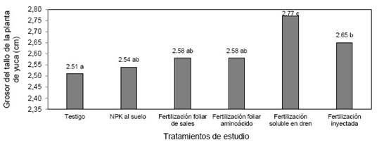 Figura 6 Diámetro (grosor) del tallo de la planta de yuca (cm). T1 = testigo absoluto; T2 = fertilizante químico NPK granulado al suelo; T3 = fertilizante foliar con sales; T4 = fertilizante foliar aminoácidos; T5 = fertilizante soluble en drench; T6 = fertilizante soluble inyectado al suelo. Letras diferentes entre valores de las columnas indican diferencias estadificas. Prueba de comparación de Duncan Alfa al 5 %.