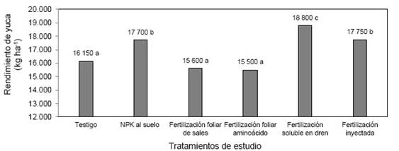 Figura 7 Rendimiento promedio de cultivo de la yuca por tratamiento (kg ha-1). T1 = testigo absoluto; T2 = fertilizante químico NPK granulado al suelo; T3 = fertilizante foliar con sales; T4 = fertilizante foliar aminoácidos; T5 = fertilizante soluble en drench; T6 = fertilizante soluble inyectado al suelo. Letras diferentes entre valores de las columnas indican diferencias estadificas. Prueba de comparación de Duncan Alfa al 5 %.