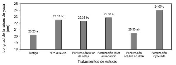 Figura 8 Longitud promedio de las raíces del cultivo de la yuca por tratamiento (cm). T1 = testigo absoluto; T2 = fertilizante químico NPK granulado al suelo; T3 = fertilizante foliar con sales; T4 = fertilizante foliar aminoácidos; T5 = fertilizante soluble en dren; T6 = fertilizante soluble inyectado al suelo. Letras diferentes entre valores de las columnas indican diferencias estadísticas. Prueba de comparación de Duncan Alfa al 5 %.