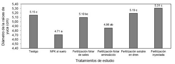Los métodos de fertilización afectaron significativamente el diámetro de las raíces de la planta de yuca (p = 0.0018; coeficiente de variación de 3.44%