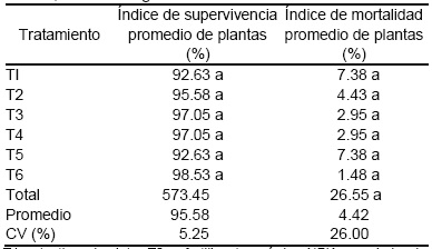La mortalidad se refiere a la capacidad de la planta para su conservación, desarrollo, crecimiento y reproducción (Guide et al., 2016). La mortalidad se reduce y se compensa con la alta absorción de nutrientes, con el objetivo de acelerar el desarrollo vegetativo de las plantas y evitar altos índices de mortalidad. Con el objetivo de reducir la mortalidad de las plantas, se adelantó la fertilización del cultivo, conforme a lo sugerido por Pilaquinga (2007).