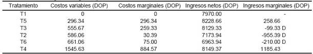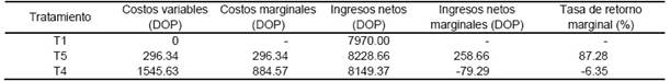 Los ingresos marginales en los tratamientos T3, T2 y T6 resultaron negativos dado que los costos resultaron mayores que el ingreso neto (Tabla 2). Por lo tanto, estos tratamientos se consideran dominados, y no se tomaron en cuenta para el análisis económico o tasa marginal de retorno.