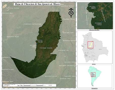 El estudio fue realizado en la comunidad Santa Rosa del Apere (CIPCA, 2020), a 46 km aproximadamente de la población de San Ignacio de Moxos (capital municipal), geográficamente las parcelas del sistema de manejo agroforestal (SAF) con cultivos en producción de cacao, frutales, maderables, palmeras, musáceas, entre otros, se encuentran a 15°12'57''S; 65°51'20''W, altitud de 198 m s.n.m. y el área de cacao nativo con aprovechamiento como sistema de manejo silvestre (SMS) (Peralta et al., 2022), se encuentra a 15°14'20.6"S, 65°49'50.9"W a una altitud de 199 m s.n.m. (Figura 1). La zona tiene una precipitación promedio anual de 2 233 mm y presenta una temperatura media anual de 27.25 °C (SENAMHI, 2019).