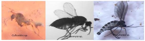 Estudios realizados por Cañarte (2021), menciona como animales responsables de la polinización son: abejas en mayor proporción, dípteros, murciélagos, aves y otros insectos. Estos hexápodos, tienen un rol importante en la polinización y reproducción de los vegetales en la naturaleza, pero para el cultivo de cacao, los dípteros con la familia Ceratopogonidae son los insectos especializados en brindar el servicio de polinización de cacao (Salazar-Diaz y Torres-Coto, 2017), con sus tres géneros Forcipomyia, Dasyhelea y Culicoides. Para conservar a estos polinizadores dentro las parcelas de cacao, se debe mantener, la diversidad de plantas musácea, forestales, frutales, nativos y cultivados, ornamentales y otros, que son fuente de reproducción, refugios y medios de alimentación de los polinizadores del cacao, de alterarse su ecosistema o por los cambios climáticos, tienden a disminuir su población y afectar negativamente en la polinización del cacao, también de especies forestales en la región de Moxos. Los especímenes colectados de sistemas SAF y SMS de cacao nativo de San Ignacio Moxos, demuestra alta diversidad entomológica entre microavispas, parasitoides (Figura 10), abejas nativas (Figura 11) y mosquitas especializadas en la polinización de flores de cacao (Figura 12).