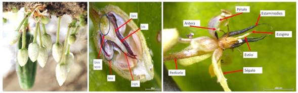 Los muestreos entomológicos, fueron: observación directa sobre flores, suelo y uso de trampas amarillas con agua, realizado en febrero de 2019, ejecutado en cada sistema de producción de cacao (SAF y SMS), con la finalidad de conocer la diversidad y abundancia de insectos asociados a la polinización del cacao. El muestreo directo y cuantificación de insectos visitantes, se realizó sobre flores abiertas en diez cojines florales por planta de cacao, utilizando lupas, captura con pinceles humedecidos con alcohol al 70 % y aspirador bucal, en diez plantas por cada sistema de producción (Figura 2), en horas de la mañana 7:00 a 12:00 (modificado a la metodología de Armijos et al., 2020). Los especímenes colectados adultos y estados inmaduros (larvas o ninfas) son etiquetados y colocados en frascos con alcohol al 70 %. El muestreo de insectos en hojas secas y suelo (tierra vegetal), se realizó cinco en cada sistema de producción de cacao, con la cuantificación directa de especímenes sobre hojarascas, restos vegetales y revisión de suelo en un área de 50 por 50 cm por 2 cm de profundidad (Montero-Cedeño et al., 2019; Alfonso, 2022).