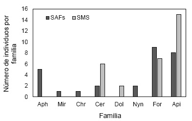 Figura 3 Número de individuos de insectos por familia registrados por observación directa en las flores de cacao en los dos sistemas SAFs y SMS. Aph = Aphididae, Mir = Miridae, Chr = Chrysomelidae, Cer = Ceratopogonidae, Dol = Dolichopodidae, Nyn = Nynphalidae, For = Formicidae, Api = Apidae.