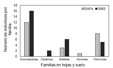 En la evaluación de hojas y suelo vegetal, se registra en ambos sistemas, a cinco ordenes y cinco familias, de ellas las más abundantes fueron Collembola, seguido de Blattidae y Formicidae (Figura 4).