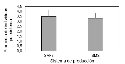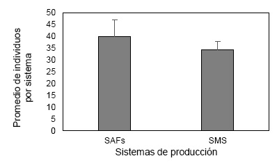 En los tres muestreos de observación directa, revisión hojarascas y suelo y trampas amarillas de agua, se registró en total 708 individuos, de ellos el 53 % corresponde al SAF y 47 % al SMS, comparados los promedios de individuos, el SAF presenta una tendencia de mayor número de individuos, respecto al SMS, con menor número de individuos, pero esa diferencia no fue significativa estadísticamente (t = 0.71, p = 0.4902).