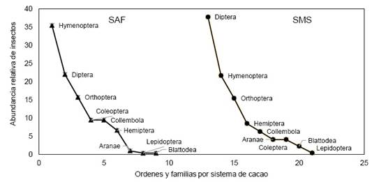 Los resultados obtenidos con las trampas amarillas de agua, corresponden el 54 % a SAF y 46 % al SMS, haciendo un total de 592 especímenes de arthropodos asociados a la polinización del cultivo de cacao en la comunidad de Santa Rosa, de los cuales 319 corresponden al SAF y 273 individuos al SMS. Respecto a la abundancia de insectos en el sistema de SAF, se registra la presencia abundante de individuos del orden Hymenoptera, seguido de Diptera, Orthoptera y Collembola. A su vez, el SMS presenta individuos abundantes del orden Diptera, seguido de Hymenoptera y Orthoptera (Figura 6).