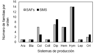 La diversidad a nivel de familias, el orden Hymenoptera es la más diversa con 14 familias en ambos sistemas, seguido de Diptera, Hemiptera y Coleoptera, en cambio los órdenes menos representados fueron Lepdidoptera, Blattodea y Aranae (Figura 7).