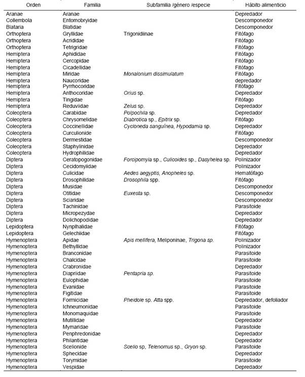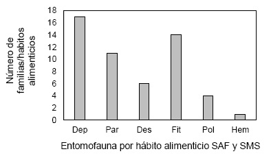La entomofauna colectada del SAF y SMS, se agrupó por su hábito alimenticio a familias que comprende diferentes ordenes, estos son: depredadores con 17 familias, parasitoides con 11 familias, descomponedores 6 familias y polinizadores 4 familias, haciendo un total de 38 familias benéficas, por otro lado, los fitófagos y hematófagos están contenidos en 15 familias (Figura 9, Tabla 1).