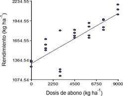 Figura 1 Regresión lineal para rendimiento (kg ha-1) del frijol negro, en El Cercado, provincia Duarte, República Dominicana.