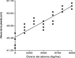 El mejor ajuste en los tratamientos con relación a la regresión lineal se obtuvo con el modelo lineal significativo al 99 %: a medida que aumentó la dosis de compost aumentó la altura de la planta (Figura 2).