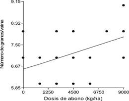 El número de vainas por planta de frijol no fue afectado significativamente por la dosis de compost aplicada al cultivo (R2 de 0.06), pero la dosis de compost si tuvo un efecto positivo significativo sobre el número de granos por vaina (R2 de 0.20, Figura 3).