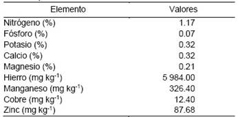 Se usó un compost con alto contenido de N, Fe (exceso), Mn (exceso), Zn y Cu (Tabla 1).